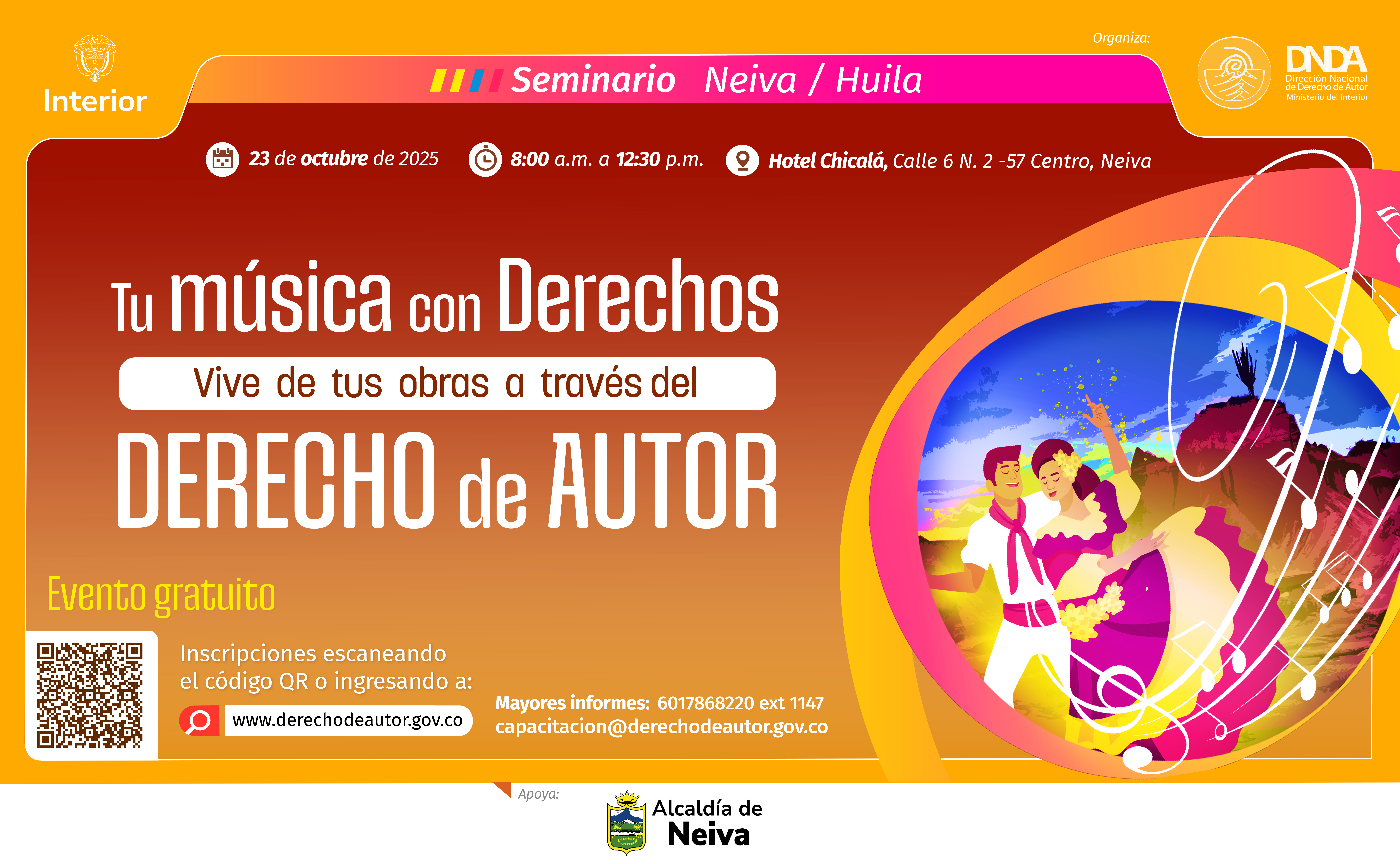 La Dirección Nacional de Derecho de Autor (DNDA), en articulación con la Alcaldía de Neiva, invita a todos los músicos, compositores, intérpretes, gestores culturales, abogados e interesados en la temática autoral del departamento del Huila a participar en el seminario “Tu música con derechos: vive de tus obras a través del Derecho de Autor”, que se realizará el jueves 23 de octubre en la ciudad de Neiva en el Hotel Chicalá, Calle 6 N. 2 -57 Centro, Neiva.